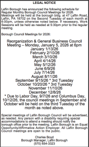 Nextdoor Laflin is a private social website managed and controlled by a resident of Laflin Borough. Although many borough officials are members and encourage the residents to use this site, it cannot be presented as an official borough communication. Please refer to this website or contact the business office for questions and concerns related to the borough. Borough officials will utilize Nextdoor Laflin for information posts only but cannot discuss issues in detail on this social forum.